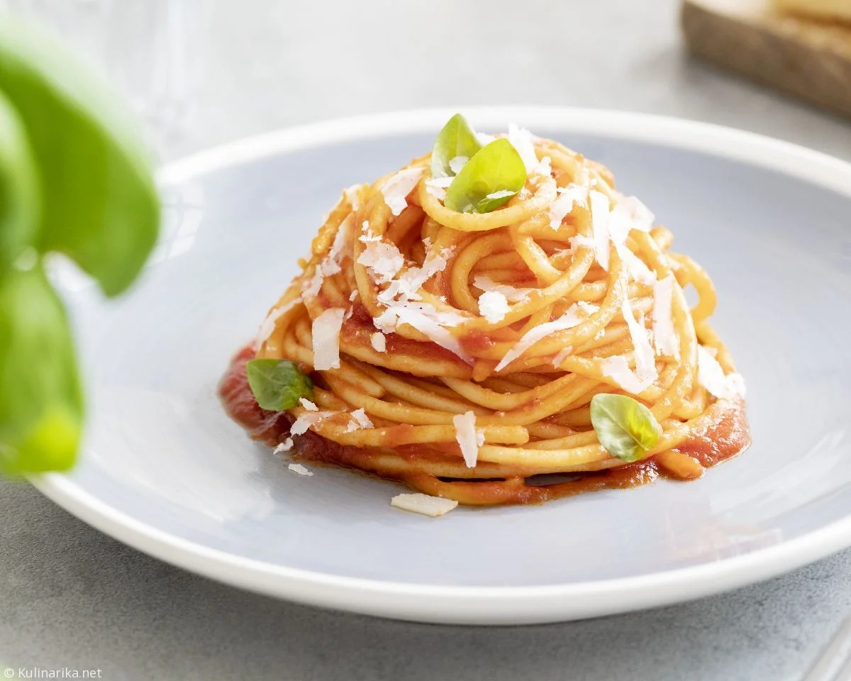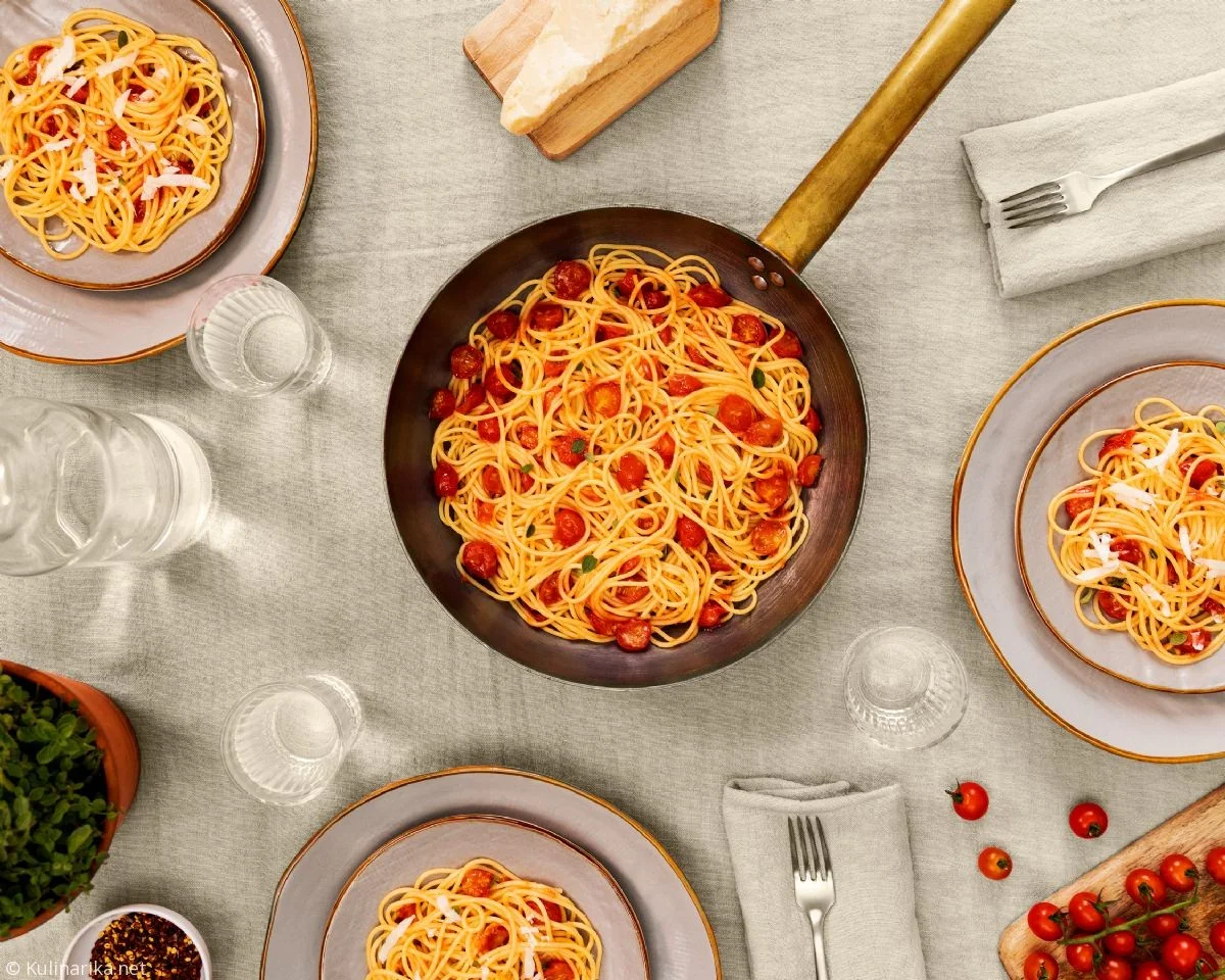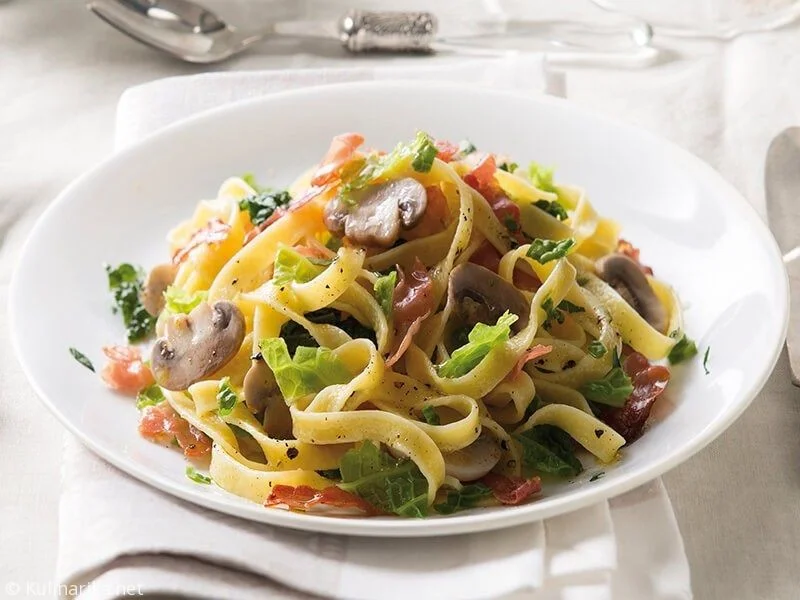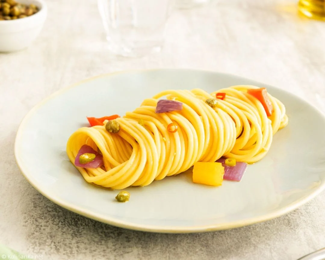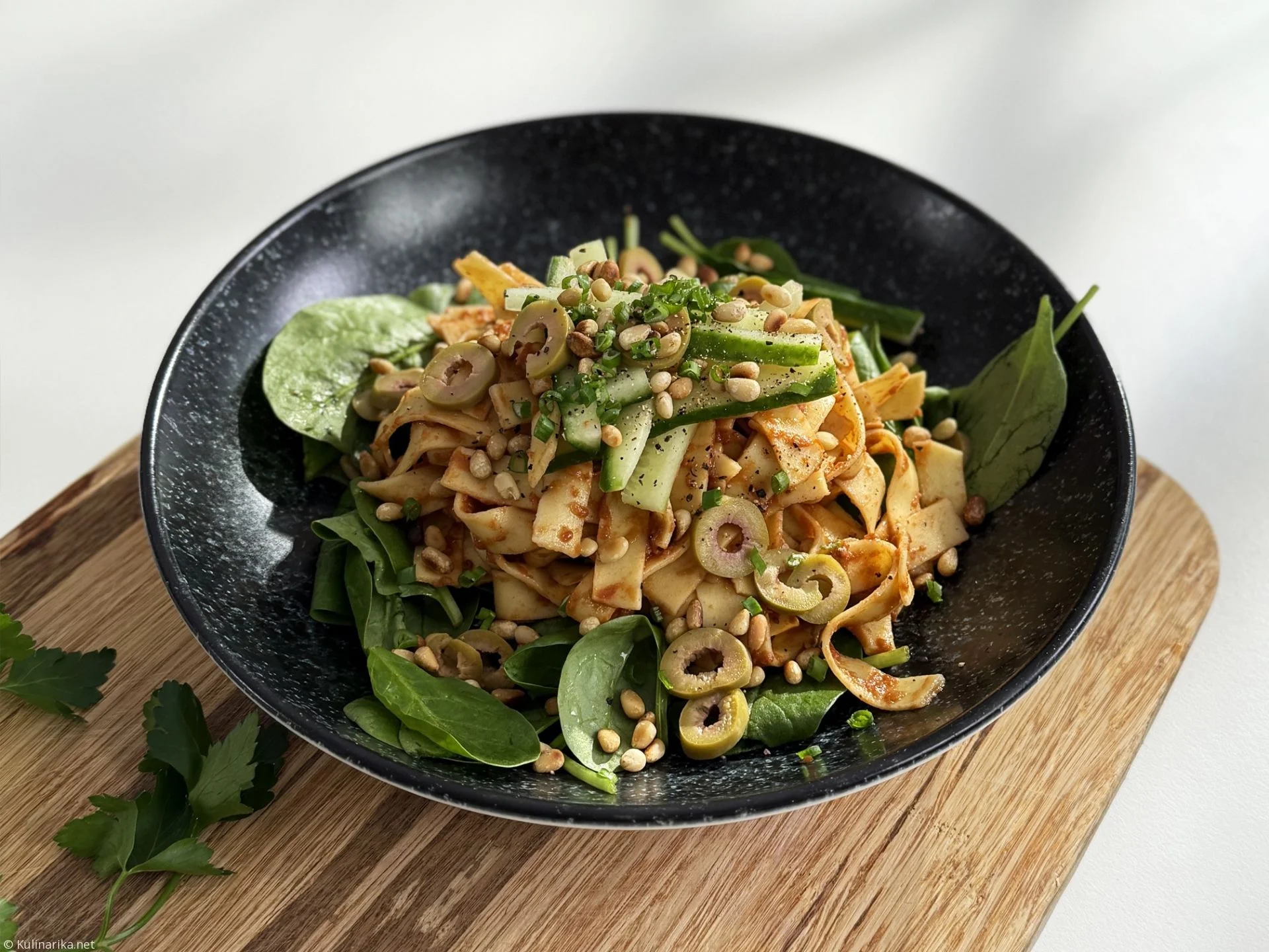 Ploščati špageti s pestom iz bazilike in feferonov, šparglji in lososom
