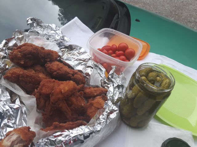 Obvezna popotniška malica našega otroštva - pohana kura in kisle kumarice. Manjkajo trdo kuhana jajca, je pa zato paradižnik. Včasih je bila še gavrilović pašteta, v vročini skorajda tekoča ...