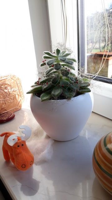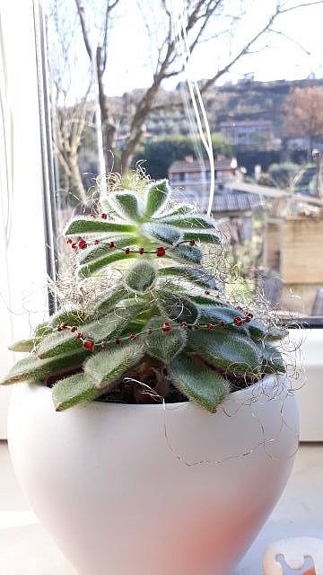 Ker je vsako leto veliko dela s pospravljanjem novoletne smrečice in ker naša dnevna soba pravzaprav ni zelo prostorna ter zaradi preveč okrasja postane utesnjujoča, sem se odločila božično okrasiti kar domači kaktus! Napravila sem girlando iz ostankov steklenih perlic in niti ter zlatih laskov, ki so se valjali po omari in priznati moram, da ko nanj posije sonce, niti malo ne potrebuje novoletnih lučk.