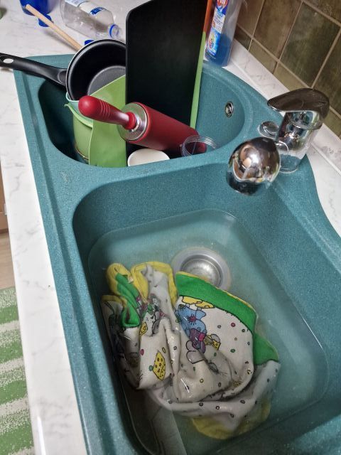 Pekač sem namočil za čez noč in zdrgnil z nohti, da so se mi obrnili. Cunjo je pa draga nekam odnesla, ne upam vprašati po usodi. A mislim, da bo preživela in je v pranju.