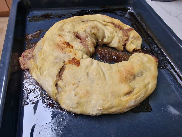 Konec dober, vse dobro. Pecivo oz. štrudelj oz. zavitek zdaj narežem, previdno, da ne bom popraskal še pekača, ampak zakaj se tako težko reže, zgleda sem res dobro testo naredil, da ni prekrhko.