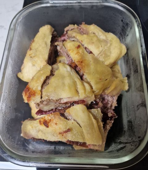Tole pišem in se tresem, kaj bo prišlo iz pečice in kakšnega bo okusa. Na koncu je zmagala moška požrtvovalnost. Zavitek je lepo uspel. Seveda je testo debelo, ko ga primeš, dvigneš samo skorjo, zgleda kot rogljiček, ki ga je v sredino nekdo zabodel, da mu izteka kri barve sliv, ampak okus je soliden. Presladko z dvema žlicama eritritola gotovo da ni. Iz pekača zaenkrat ne gre lepo, ampak strpnost da se ohladi ni moja vrlina. Vseeno opustim, bom počakal pol ure.