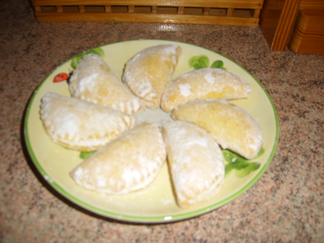 Vse sestavine zmešamo v testo, ki naj počiva 1 uro. S kozarcem (ali modelčkom) oblikujemo kroge, ki jih namažemo z marmelado ali poljubnim nadevom..kar vam na pamet pride), robove namažemo z beljakom da nadev ne uhaja, prepolovimo ter stisnemo z vilico. Pečemo 15-20 minut. Povaljamo v sladkornem prahu, in že se lahko sladkate.. Ja, ja..simpl kt pasulj.:)