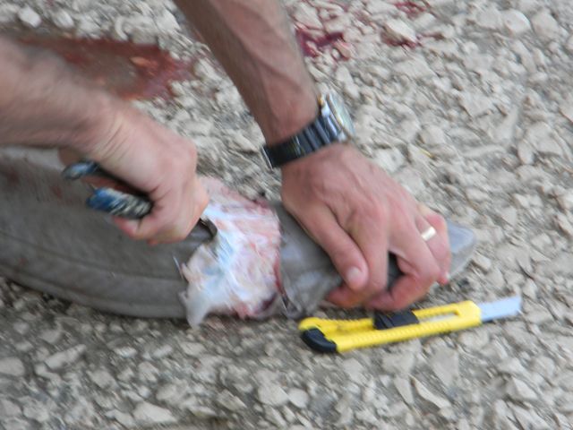 Med bolj nenavadnimi ribami , so mi letos moji ribiči uturili morksega psa, ene pet kil je imel. Vse lepo in prav, zanj sem jim dal bagatelo, ene 20 HKN za celega. Se je pa pojavil problem- psa je potrebno odreti, saj ima povsem neužino kožo, trdo in bolj hrapavo kot vsak smirkov papir. Nekoč sem že videl kako se tej reči streže vendar nisem imel nobenioh izkušenj s tem. Vedel sem le, da je za odiranje potrebno imeti klešče in nadvse oster noč. Zato sem še takoj, ko sem ga privlekel domov k Vedranu, bratu od gazdarice, ki živi v enem prizidku ob njeni hiši/naši hiši, če ima klešče. Seveda jih je imel, še več, ponudil mi je še skalpel (OLFA nož) in me vprašal, če bom sam odiral. Ja, sem rekel, ,kaj pa čem. No, je odvrnil, ti bom pomagal če češ, čeporv ga tudi sam še nisem odiral.