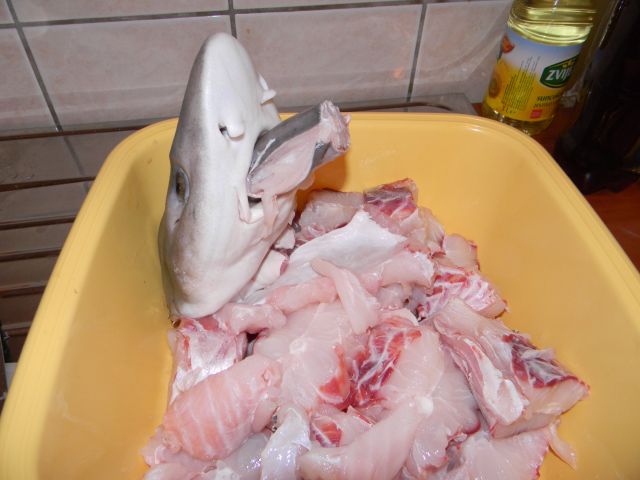 Vse skupaj je trajalo ene dve uri inob tem sem spoznal, da je morksega psa lažje uloviti kot pa odreti. Vendrana so ob delu užgale dve osi, mene ena sama, enkrat si je skoraj odrezal prst, jaz pa sem njegov skalpel skrhal u nulo, sploh ni več rezal kot bi moral. Ampak sva ga slekla in si po tem mukotrpnem delu, privoščila eno bevando, tako, podaljšano. Naročil mi je še, da ga moram preden ga bom kuhal ali pekel obvezno namočiti za ene 24 ur v mleko kajti, "to ti je divljač i mora da mleko povuče onaj neprijatan okus iz njega". No prvič sem slišal da je potrebno to narediti ampak sem ga ubogal, seveda pa sem tudi njemu dal nekja zajetnih fet te mrcine, se je namatral .