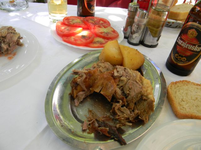 Tam okrog Čapljine sva kupila sveže breskve po 2 bosanke KM sva plačala za kilo, bile so sladke, sveže in sočne. Dolina Neretve ima pač sadja v izobilju in škoda bi bilo, da se ga ne proba. Vožnja je nato brez posebnosti potekala do Jablanice, kjer se po vseh predpisih in priporočilih človek mora ustaviti na jagnetini,ki je najboljša v celi Bosni. Imam pa iz leta v leto isto težavo. Nikoli se ne ustavim v tisti restavraciji, ki velja za najboljšo, imenuje se Zdrava voda ampak jo vedno zgrešim. No tudi letos se mi je zgodilo enako in ustavil sem pre Lovskim domom, imel sem pač občutek da gre za pravo restavracijo, peklo se je ogromno jancev,avtomobilov je bilo nebroj kar je vse pričalo, da se tukaj dobro je. Šele ko sva po kosilu nadaljevala pot sem ugotovil, da je ta nesrečna Zdava voda še nekoliko naprej in je v bistvu zadnja v nizu vseh restavracij v smeri proti Sarajevu.