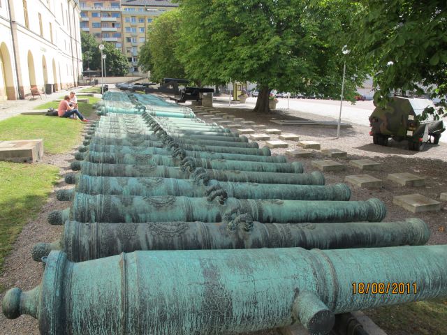 Ko tole pišem, poskušam se ognit temu, da bi se ponavljal, pa večkrat niti ne vem koliko mi uspeva. Stockholm je mesto muzejev ( evo, to sem menda zapisal že eno desetkrat ), in se da res videti veliko zanimivih reči. Zgodovinsko gledano, švedska je taka država kot vse druge: ko jim je šlo dobro, so se spravili na sosede ( sosedi so verjetno počeli enako ), ko jim je šlo slabše so se mal potuhnili ( da ne rečem brusili meče in se pripravljali za boljše čase ). V glavnem so se garbali s Danci, Nemci, Poljaki in Rusi ( miroljubni neki ljudje, nikoli se niso spravili na Grke, ali Špance, recimo [vrazicek]). Pred armemuseum v Stockholmu se da videti tale vrsta topov: