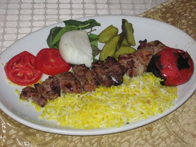 Riž z žafranom, kebab (jagnjetina); tipično iransko - na pogled ne tako zelo razkošno, a po okusu ...