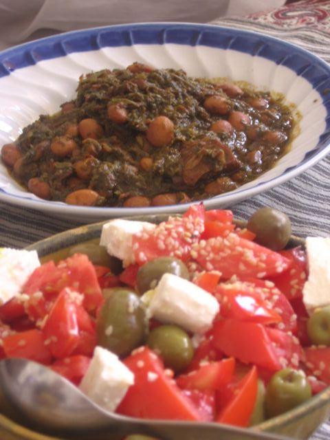 Iz solate sem izbrskala paradižnik in ga dala na drug krožnik, ga namreč ne jem; a v ozadju je enolončnica iz kameljega mesa in čičerike; nepozabno (Iran)