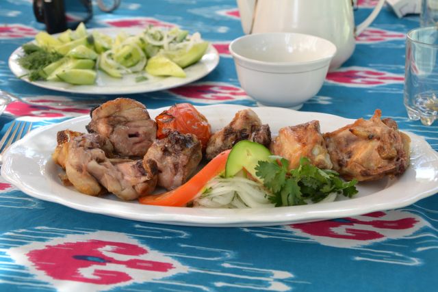 Kebab, tokrat piščančji, kot ga pripravijo v Uzbekistanu (Buhara)
