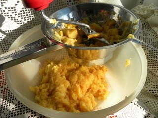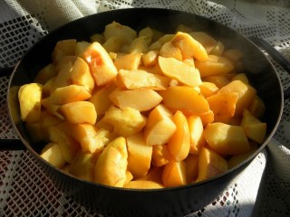 Kutino narežemo na kocke( pazimo, da si ne prerežemo prste...) ter jih z nekaj vode kuhamo 20-25 minut.