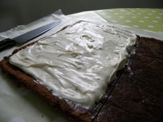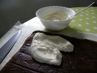 Ohlajen biskvit razrežemo na dva enaka dela in ravnotako peki papir. En del premažemo s kremo z drugim pa pokrijemo.