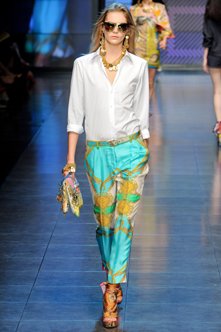 Nekatere punce že poznate moje mnenje o vzorcih in temu, da so »najboljši tisti vzorci, ki so v eni barvi«. Stvar je taka, vzorci so salamensko zahtevni in dokler niste kolikor toliko suverene z oblačenjem, se vzorcem izogibajte. Ko pa boste s kombiniranjem že bolj na ti, potem se pa lahko igrate z vzorci. In ko to počnete, delajte z najboljšimi. Z naskokom najboljši vzorci in potiski so tisti, ki spominjajo na Hermésove rute in šale. Tovrstnih potiskov bo letos kar veliko. Če ste višje od 170 centi in je vaša številka 40 ali manj, potem boste lahko paradirale v bluzici ali tuniki s potiskom v maniri Hermésovih šalov. V Zarini liniji je tovrstnih kosov kar nekaj in bodo slejkoprej tudi pri nas. Če ne padete v ta razred, lahko uporabljate tak šal namesto pasu na kakšni mali črni oblekici (deluje), zabavno pa je tudi tak šal zavezati okoli roča torbice in dobi torbica čisto novo življenje. Na pričujočem linku imate ekstremne kombinacije teh oblačil (gre za bolj kežual linijo od Stefana in Domenica, njuna glavna linija me letos ni posebej navdušila). Na tega popolnoma posnemati, en kos bo čisto zadosti.
