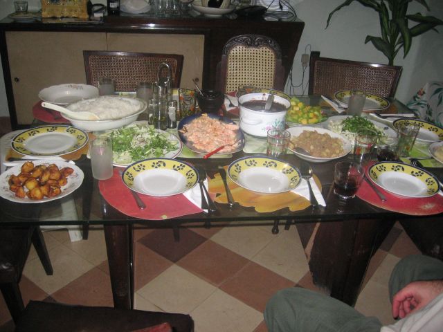 Pričaka nas polna miza: komaj pomnim vso hrano, vem samo, da je bilo vse tako neverjetno dobro: juha iz čičerike, črni fižol z rižem, solata iz zelja, kumar in avokada, zrezki v eni čisto preprosti omaki, a tako neverjetno dobri, kuhan sladki krompir s česnom ... in rum s eveda, pa cola, če kdo ne bi zmogel čistega.