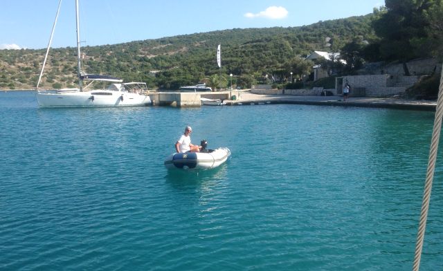 Sidramo v nasprotnem kraku zaliva na bojah zelo simpatične restavracije Pipo. Lastniku je takoj jasno, da ne bomo njegovi gostje ne na večerji niti čez noč, pa nam kljub temu prijazno pomaga pri privezovanju. Za malico skuhamo nekaj kranjskih klobas, zraven pa ribja juha in carpaccio iz tiste druge včerajšnje palamide. Potem se s čolničkom zapeljemo na obalo in pri prijaznem gostilničarju malico še poplaknemo.