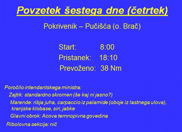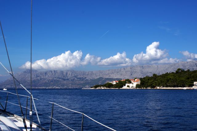 Takoj po izplutju iz zaliva so spet vsa jadra zunaj. Zdaj smo pred podobno dilemo kot včeraj - kje zaključiti dan. Pučišća nam je preblizu, zaliv Splitska pa predaleč, saj bi želeli pristati še za svetlega. Vsekakor nujno potrebujemo varen privez z elektriko. Zato še malo vozimo v smeri Omiša (pač iz čistega užitka), po nekaj manevrih pa se obrnemo in z vetrom v pol krme priplujemo v Pučišćo. Zelo lepo urejeno naselje.