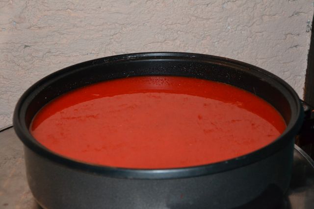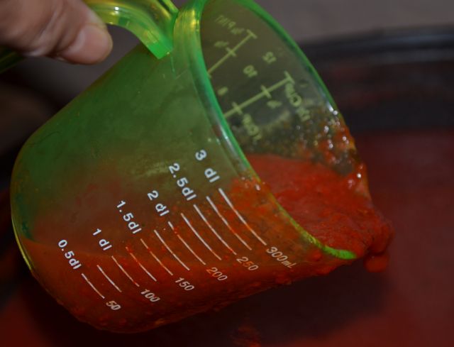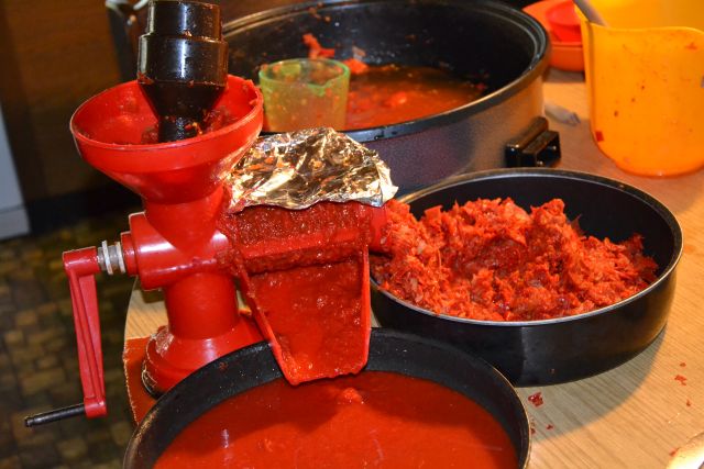 Dva dni kasneje, ko sem si temeljito odpočila, mi pri čiščenju paradižnika in paprike ter rezanju pomaga mož. Naslednji dan hladno maso pasiram sama, lepo mi gre od rok. Dobro no, malo teče ob mizi, a na stol dam polivil in krpo in na to posod, da vse ne teče po tleh.