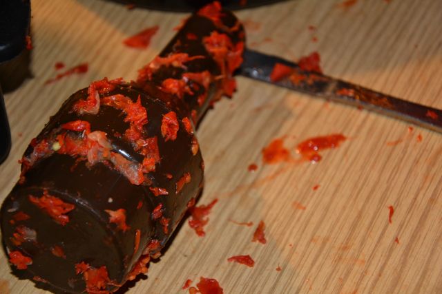 pa tu in tam špricne kaj naokoli, vmes je treba z nožem postrgati in očistiti luknjice na nastavku, da lahko pasiramo naprej ...