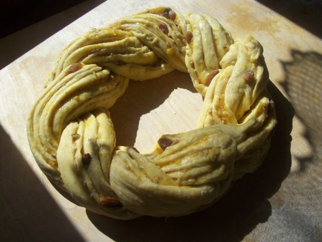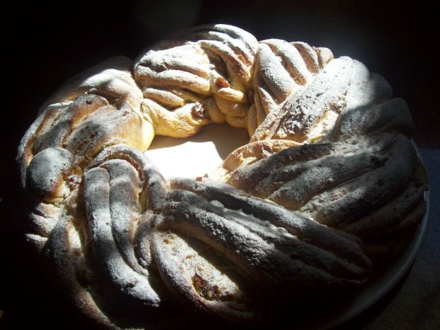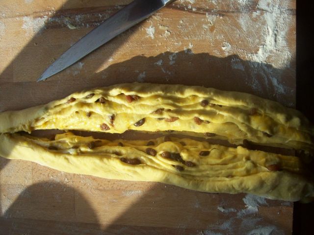 Testo zvijemo po dolgem, prerežemo na pol, tako da je videti nadev, rahlo razpremo oba dela in naredimo kito. Prerezana stran naj bo zgoraj. Kito oblikujemo v krog, venec( me je zmotila soseda, vmesne slike ni... )prenesemo na pekač s peki papirjem, premažemo z maslom in spečemo. Rozine se zelo rade zažgejo, zato, ko je pecivo zlate barve, pokrijte s papirjem!