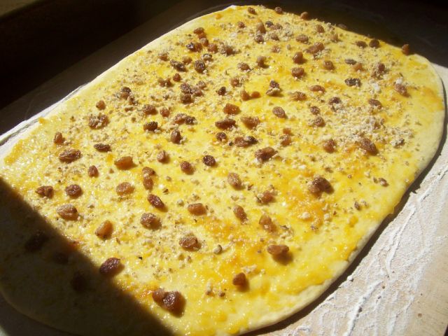 Da si spočije(va) od potice, sem v nedeljo naredila tale kolaček. Ker blog še ni bil nazaj na internetu, sem pripravila kar testo Lonino za orehovo potico. Razvaljano testo sem premazala s pomarančno marmelado in natrosila nekaj (veliko) rozin iz ruma ter mandelje za malo crunch-a. Hvala Lučka za dobro idejo.