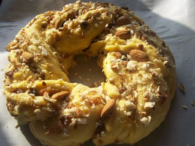 Danes je cvetna nedelja,zunaj imamo ponovno burjo in sneg,tako da je prav dobrodošel tale recept.Venec se peče in prav lepo diši.Iz te količine testa sta nastala dva venčka(marelična marmelada in lešniki,ter pomarančna marmelada,pinjole in rozine).