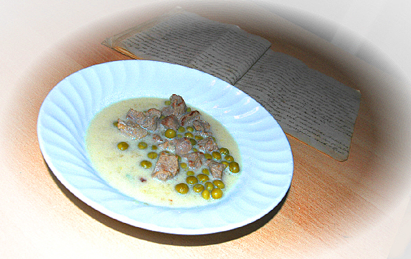 Tri četrt kile jagnjetine zreži na koščke kakor za golaž. Loj poberi v stran in ga porabi za prašiče, ker ni okusen in ima neprijeten duh. Meso popari v skledi. Ko se malo ohladi, odcedi vodo proč in jo tudi lahko porabiš za živali. V kozo deni dobro žlico masti, na vročo mast malo zrezane čebule. Ko čebula porumeni, stresi v kozo poparjeno meso, osoli in pusti, da se malo popeče. Nato dodaj tri četrt litra zluščenega graha in duši eno uro in pol. V skodelici zmešaj žlico moke in tri žlice smetane*1 in mešaje prilivaj, nato zalij še z malo vode, da dobiš primerno gosto omako. Dodaj še malo sesekljanega peteršilja, tiln in pusti, da vre še deset minut, nato daj jet*2 takoj na mizo.