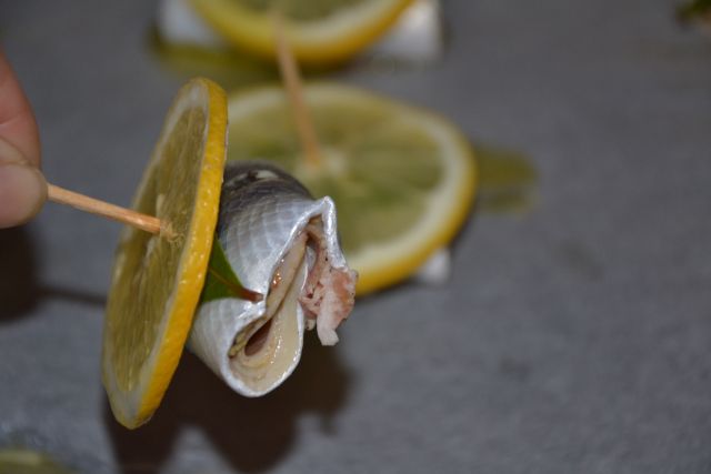 No, za začetek smo dobile lahek grižljajček: sardelni file z limono in lovorjem, pečeno v pečici, z dodatkom zelišč. Odlično.
