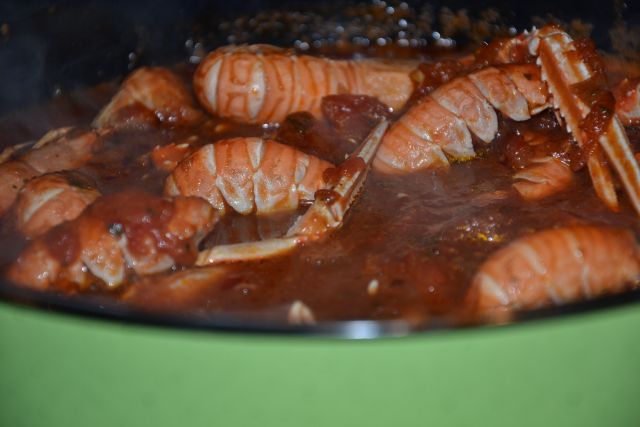 No, vmes smo »tolkle« po aperitivu, nad katerim smo se navdušile v petem krogu, potem pa je sledil osrednji obrok: škampi na buzaro a la naša gostiteljica. Kake velike filozofije pri buzari itak ni, osnove so znane, gre bolj za dodatke: konjak, začimbe, maslo …