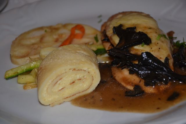 Glavna jed je bila – uh. Piščančji file s črno trobento in zraven sirov štrukeljček, kruhova rezina in na paličice narezane bučke, motovilec za spremljavo. Nebeško.