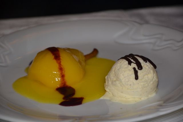 Odločitev za sladico je bila vražje težka, pa smo nekatere upoštevale nasvet moje drage kulinarične prijateljice Vendeline jr: če se ne moreš odločit med dvema stvarema, vzami obe. Tako smo uživale v hruški, kuhani v belem vinu in začinjeni s kurkumo,