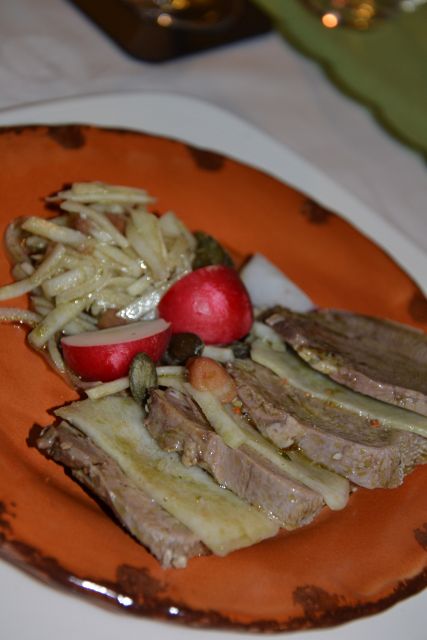 No, čakal nas je mariniran svinjski jezik z dodatkom črne redkvice in fižola - kako je bilo to slastno ... Sočno, zavoljo redkvice samo malenkost pikantno, nekaj kapljic bučnega olja za še popolnejši okus, črna redkvica s fižolom pa itak ni, da bi posebej omenjala. Nebeško.