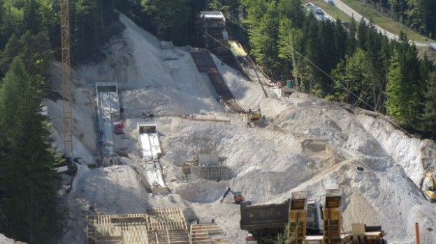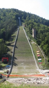 Ko smo se peljali še zadnji del poti proti Kranjsko Gori, je sinko zaspal, zato smo se odpravili kar naprej do Planice, da bi mi otrok dlje časa spal. Pripeljali smo se do prve skakalnice, ko je do nas prišel mlad gospod, ki je pobiral ekološki prispevek(?) v višini 2 evra. Nič ni zastonj, niti ogled Planice ne. Je pa res, da marsikdo tukaj parkira in se odpravi peš v Tamar. Mi smo si samo ogledali dve novi skakalnici, opazovali gradnjo petih novih in občudovali velikanko, ob vznožju katere tudi potekajo dela.