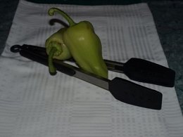 kupila sem štiri zelene "rog" paprike. V skrinji je bila vrečka mletega, ampak zadnji trenutek sem opazila, da imam enih 5 - 6 čevapčičev, zmrznjenih, seveda. Ne vem od kdaj je to ostalo. Vzamem ven te čevapčiče in jih pustim, da se malo odtajajo.