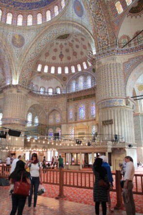 In potem smer – Modra mošeja. In Hagija Sofija (Ayasofya po turško - http://sl.wikipedia.org/wiki/Hagija_Sofija), seveda. Pa smo delali račun brez krčmarja. Sveta modrost je muzej in kot taka je bila v ponedeljek zaprta. Modra kot verski objekt je bila odprta in smo si jo šli ogledat. Kako sem pozabila v avtu ruto, ki sem jo vzela nalašč za to priložnost, ne bom razlagala. Sem se že sprijaznila, da notranjščine ne bom videla (oba sopotnika sta že odkorakala noter), potem pa je v meni zmagala trma in sem pač šla v eno izmed ozkih uličic, da si kupim kakšno ruto. Medtem me je zmotil telefonski klic – prvi sopotnik mi je sporočal, da takim pozabljivkam, kot sem jaz, delijo pokrivala (oprana in lepo zlikana) na posodo v mošeji. Ampak ker sem že držala v roki čudovito srebrno-sivo ruto, z uvezenimi majcenimi vrtnicami (in jo v mislih namenila mami za darilo), me klic ni kdovekako ganil. Plačala sem tistih šest lir (sicer sem kar globoko prepričana, da je mejd in Hongkong, pa mi je vseeno) in odkorakala v mošejo. In obstala z odprtimi usti, ker je bilo res zanimivo. In lepo. In veličastno. Se splača videti.