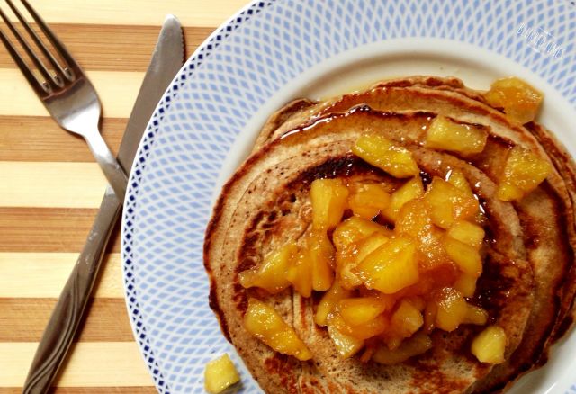 Variety is the spice of life, kot pravijo, tako da so ameriške palačinke dobile vstop na zadnjo edicijo brunch menija, kjer smo jih pospremili z javorjevim sirupom in karameliziranim ananasom. Uporaba polnozrnate moke je v tem primeru zgolj naključna, saj je kolegica zadnji trenutek opazila, da ima le (dobesedno) 'blagoslovljeno' polnozrnato moko, ki jo je dobila od šefice za božič.