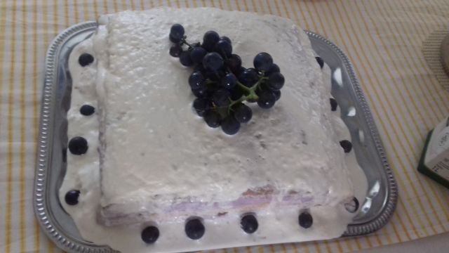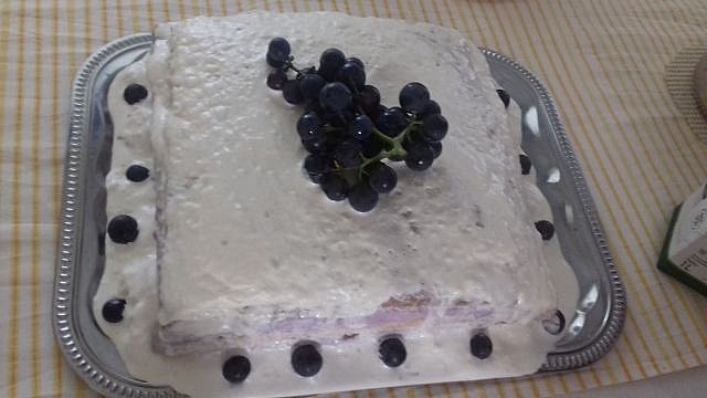 In ker imata starša ravno obletnico poroke - se kar lotiš peke. Najprej biskvit. Ki bi moral biti v treh plasteh. Pa je tebi uspelo naredit samo dve plasti. In še to komaj komaj. Potem se pa začne prava veselica. Iz grozdja narediš grozdni sok. Ok, to gre. je zamudno, a gre. Grozdni sok zmešaš z mascarpone sirom in grškim jogurtom. Potem stepeš sladko smetano. Sredi stepanja ugotoviš, da ni smetana za stepanje, ampak smetana za kuhanje. Ajej. Jah nič ... gremo v trgovino. Po smetano za stepanje. In jo stepaš in stepaš ... Malo se zgosti, trda pa ne rata. Ok, bom dala malo več želirnih listkov not, ni panike. Ampak tud po dodanih želirnih listkih je zadeva še vedno tekoča. Majkemi ... Nič ... grem še enkrat v trgovino ... po tono želirnih zadev. Ampak ker je že pozna ura ... trgovine niso več odprte .. jaz bi šla pa spat. In grem. Možu še rečem, da bom jutri potrebovala še kako urco (verjetno manj) za dodelavo torte. Sej naredim samo maso in namažem na biskvit in fliknem v hladilnik. Lej ... sploh ni panike.
