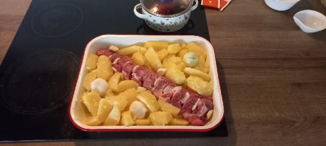 Hojla! Danes za kosilo. Mlad krompir pečen na rastlinskem olju. Priloga: na olivnem olju popražimo dva stroka česna. česen vzamemo iz olja in na olju opečemo na koščke narezano nasoljeno puranje meso (meso za par minut namočimo v mleko, da je bolj sočno). Opečeno meso zalijemo z 1 dl suhega belega vina. Ko se vino povre zalijemo z zajemalko prej pripravljene zelenjavne juhe in meso dušimo. Dodamo na kocke narezane jurčke ali na lističe narezane šampinjone. Dušimo do mehkega in občasno zalivamo z juho. Na koncu v jed vmešamo eno pest sesekljanega peteršilja in popražen česen, ki smo ga oduzeli iz olja, da se nam ni prismodil. Zelena solata - berivka z na tanke lističe narezano rdečo redkvico. Dober tek. Ažokoh.neznan uporabnik