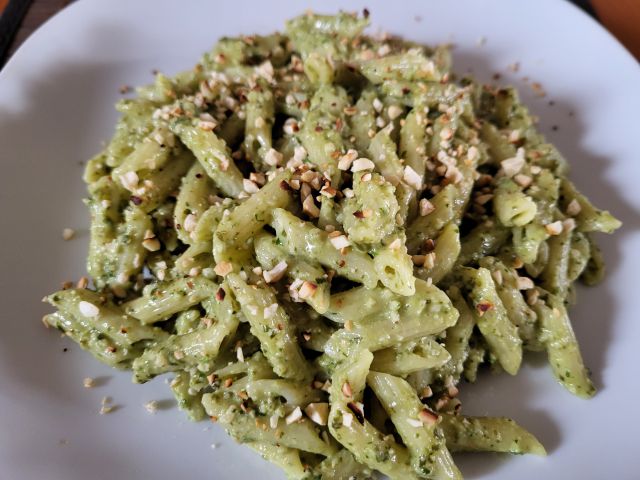 Ploščati špageti z genovskim pestom, krompirjem in stročjim fižolom