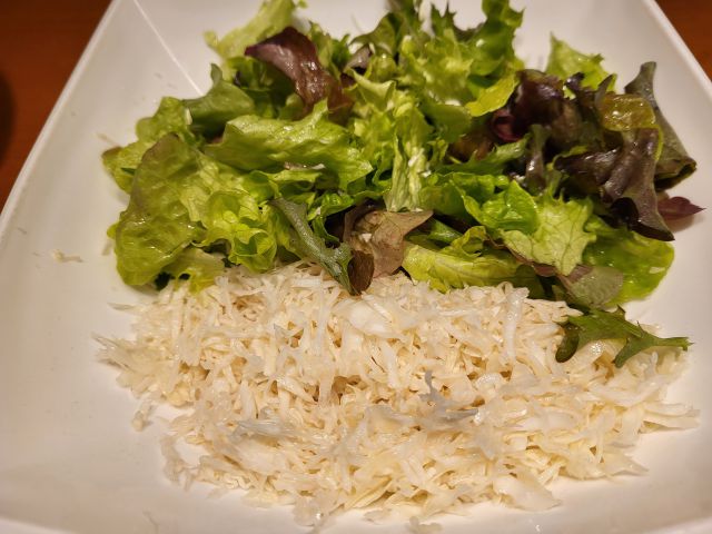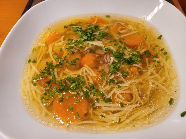 26.10 goveja juha z rezanci, omaka s čemažem in indijskimi oreščki, testenine, solata