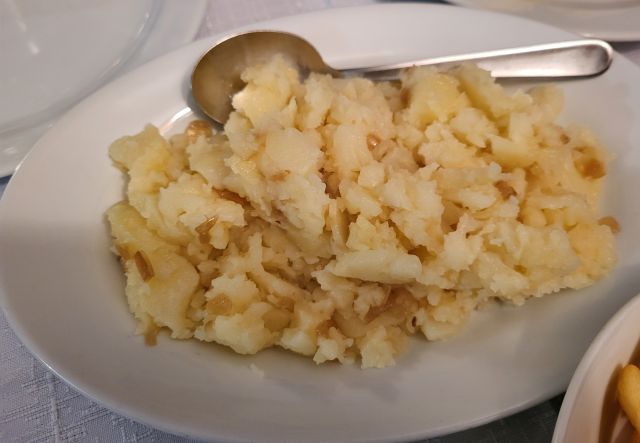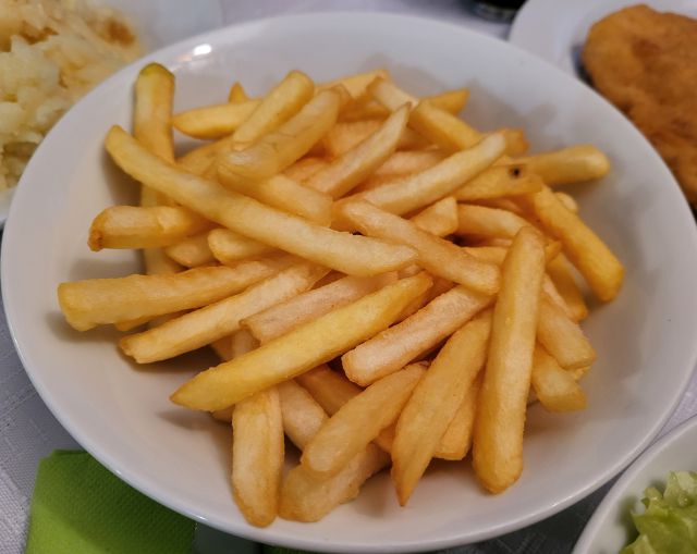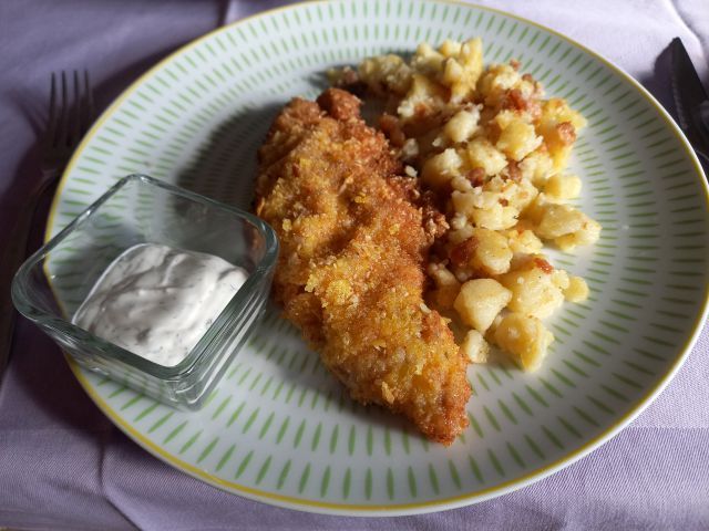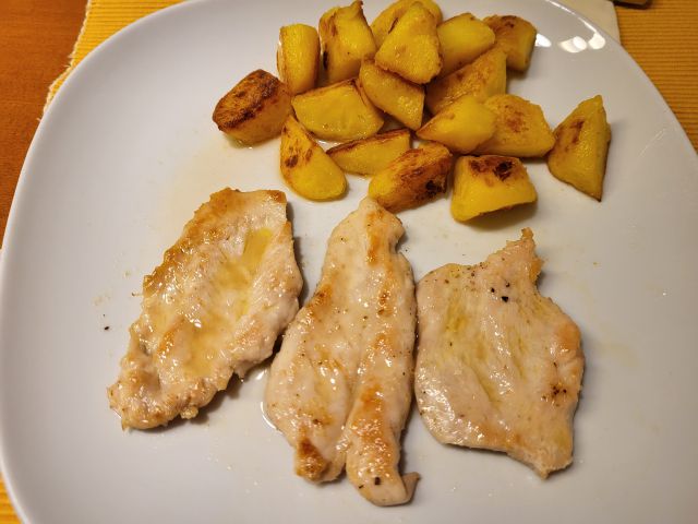 V petek midva s sinom piščančji fileje, popečen krompir, zeljna solata. Mož segedin iz zaloge, kuhan krompir, kruh