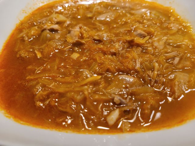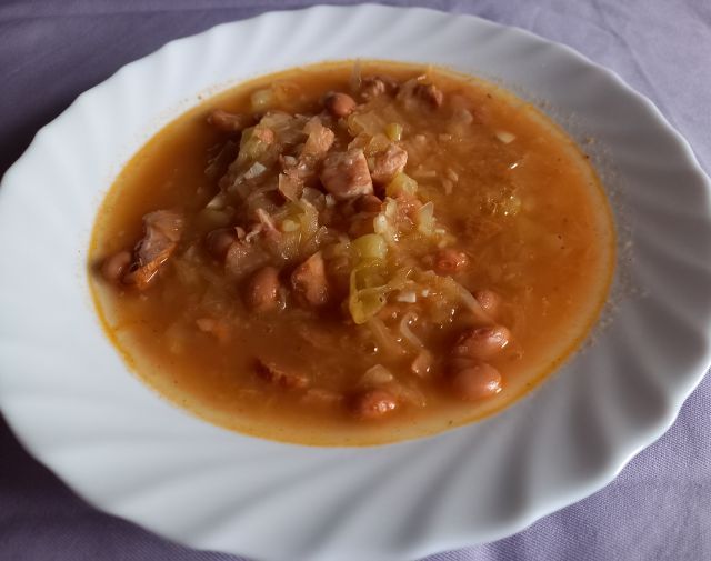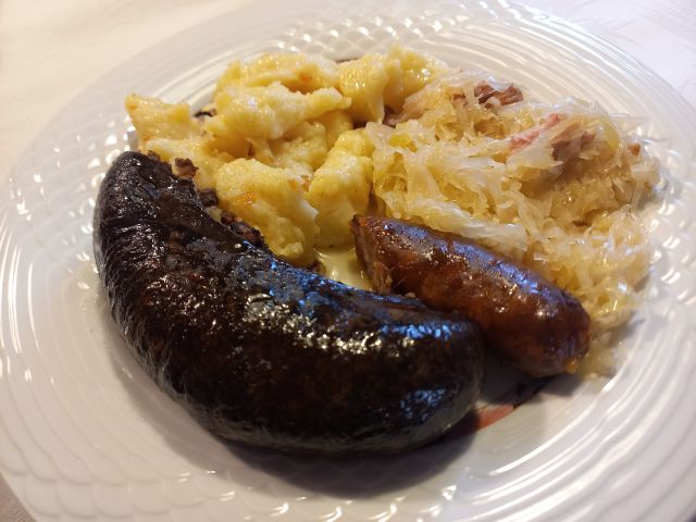 Goveje/kurja juhica, kislo zelje, beli žganci, krvavica in pečenica