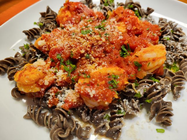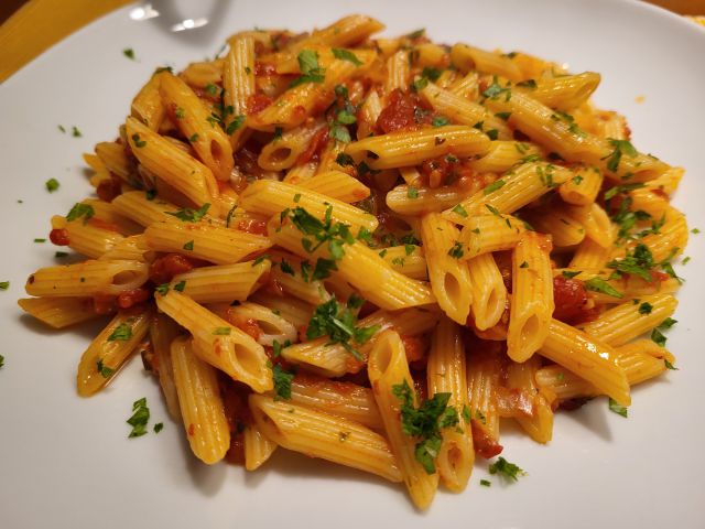 Danes goveja juha z rezanci, domača paradižnikova omaka - ena z dodatkom pekoče mešanice, druga z gamberi, za moja dva penne rigate, zame ajdovi svedrčki, solata, tiramisu