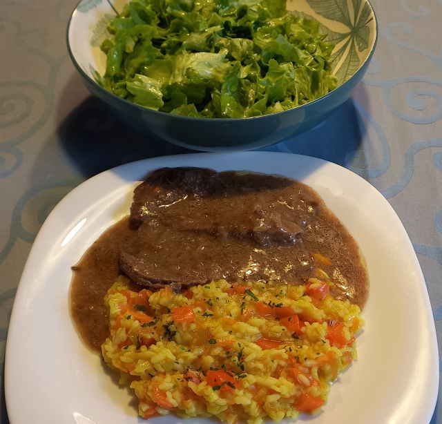 Goveji zrezki v naravni omaki, zelenjavni riž, zelena solata