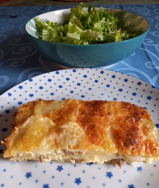 Gobova juhica; krompirjeva musaka; zelena solata z zeljem