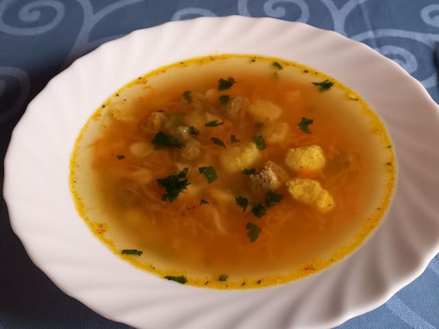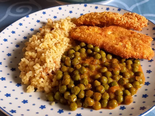 Juhica - nariban korenček in juha iz vrečke; bulgur na čebuli in ocvirkih, grah v omaki, panirani piščančji trakci; radič s krompirjem