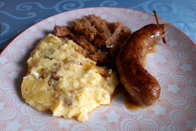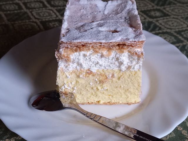 Polenta z ocvirki in feto, dušeno zelje, pečenica; kremšnita