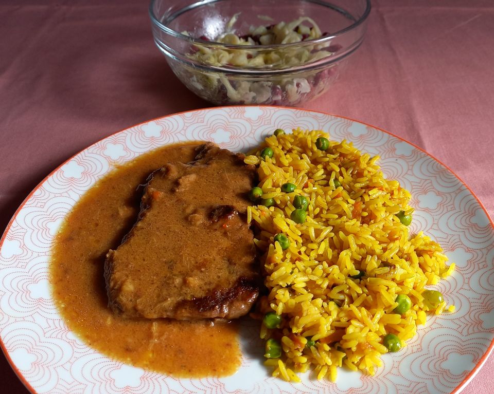 Danes zelenjavna juha, svinjska ribica v gobovi, njoki, solata, krof