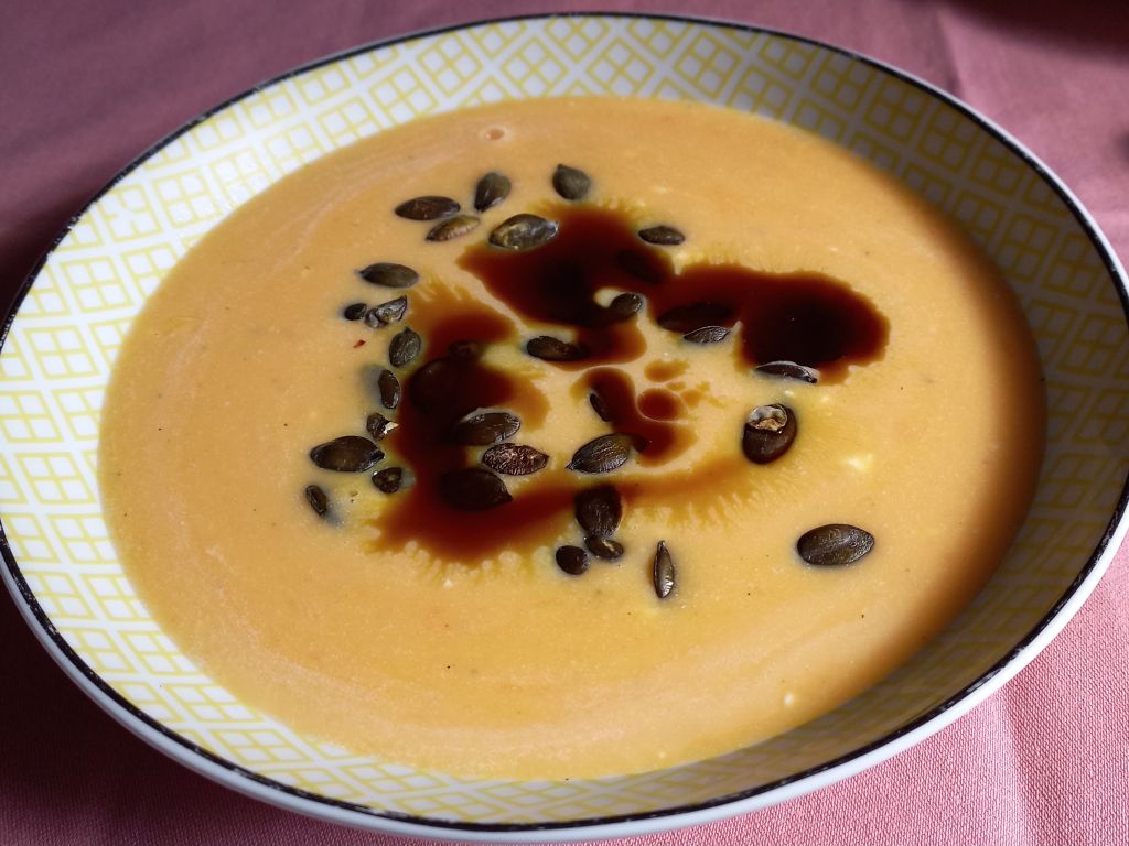 Bučna juhica s popečenimi semeni; rizi-bizi s kurkumo, goveji zrezki v naravni omaki; zeljnata solata