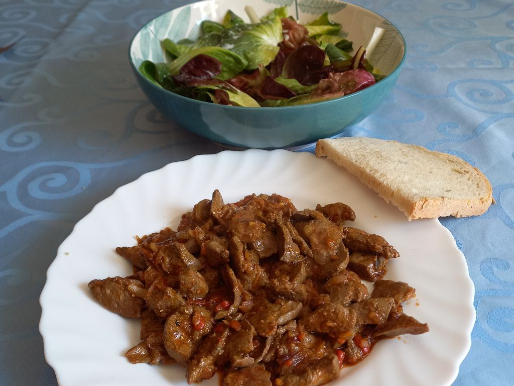 Pražena jetrca; večbarvni radič s krompirjem