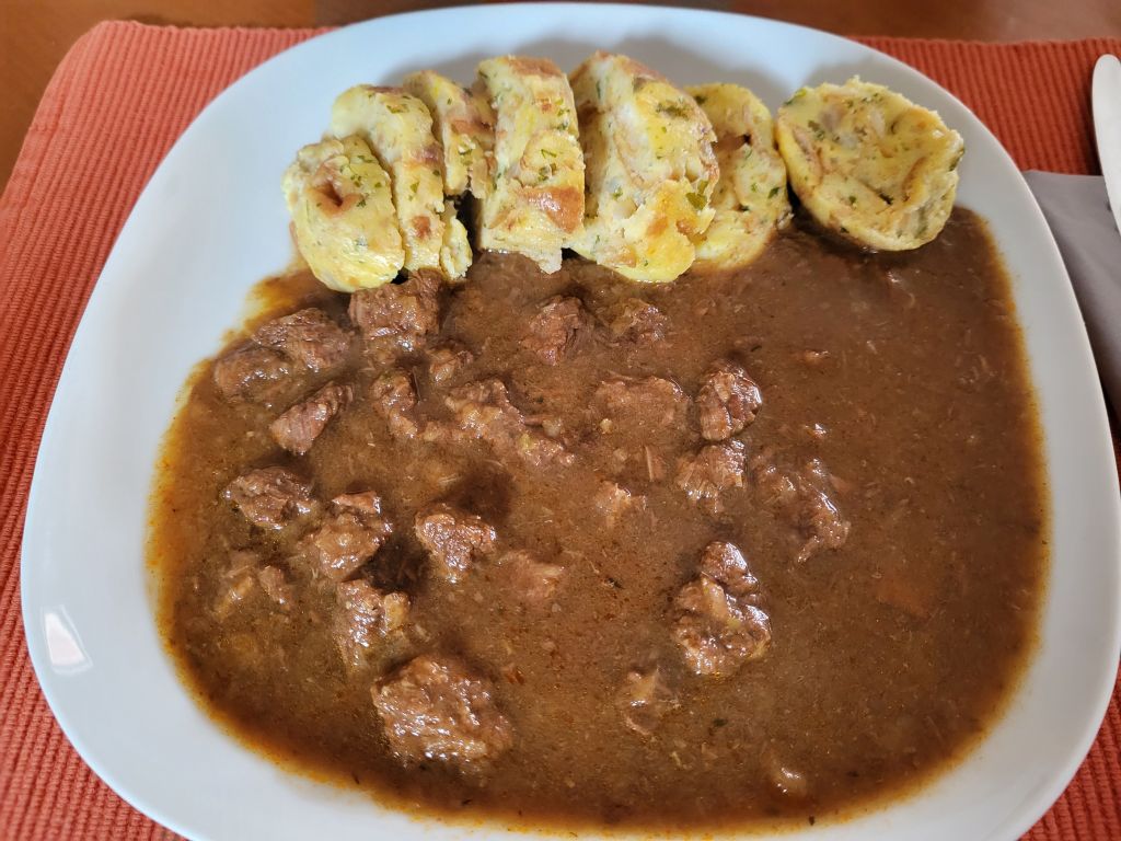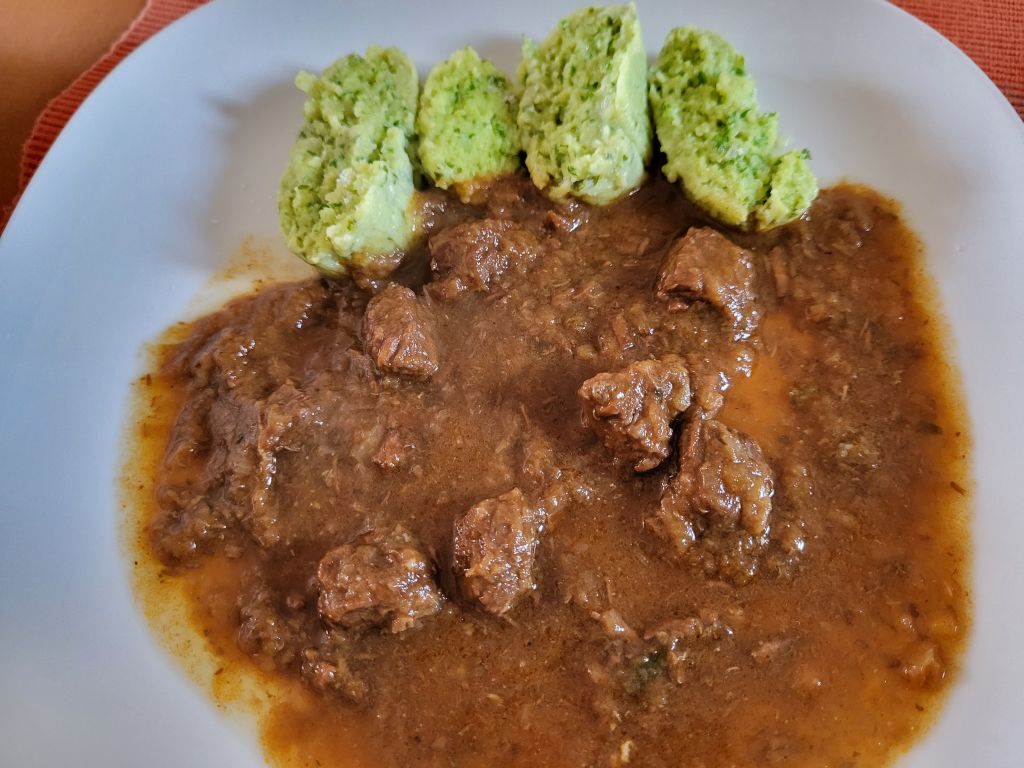 17.4 goveji golaž, kruhovi cmoki,čemaževe skutno riževe rezine, solata
